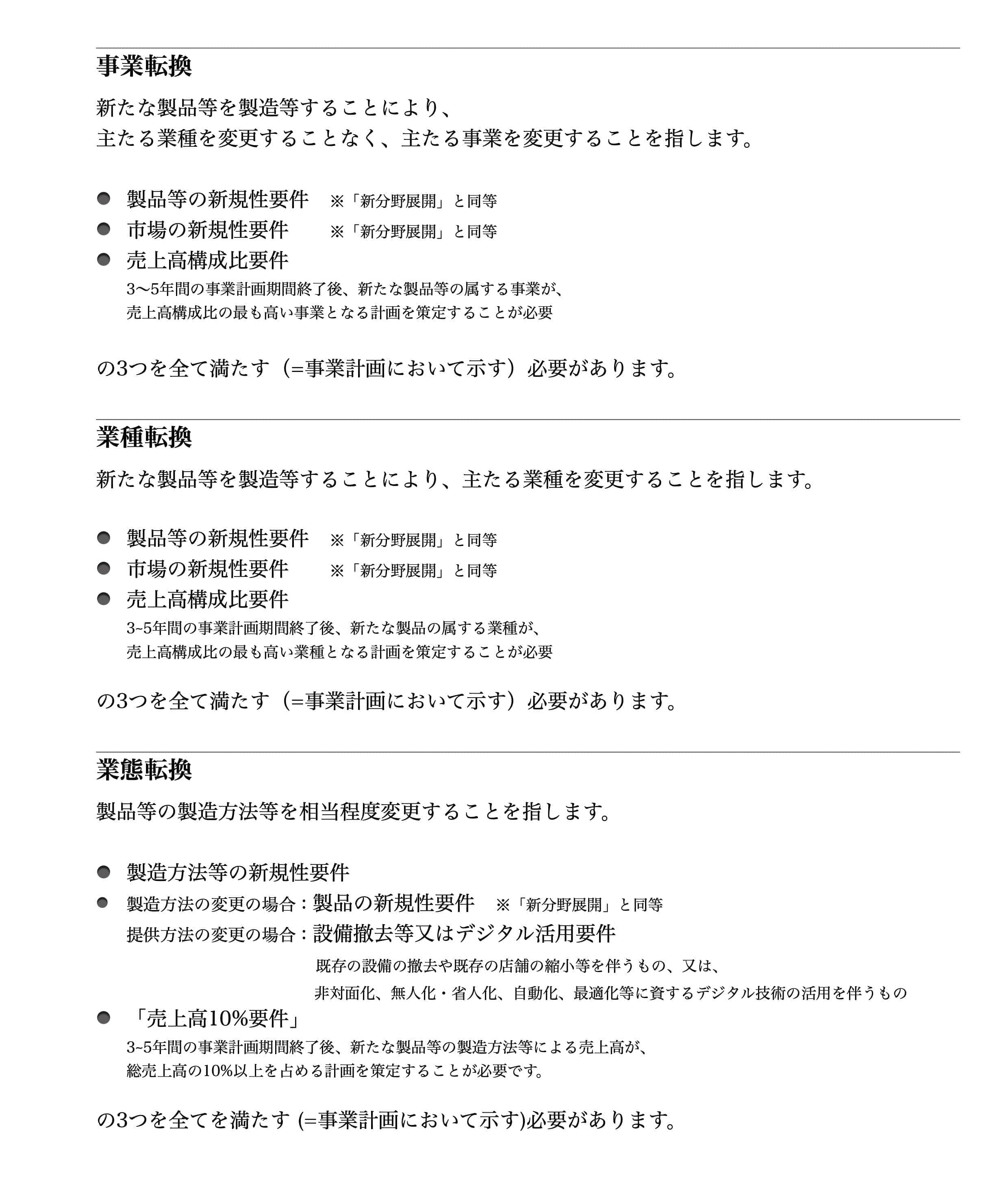 「新分野展開」に該当するためには、「製品等の新規性要件」、「市場の新規性要件」、「売上高 10%要件」の3つを全て満たす(=事業計画において示す)必要があります。