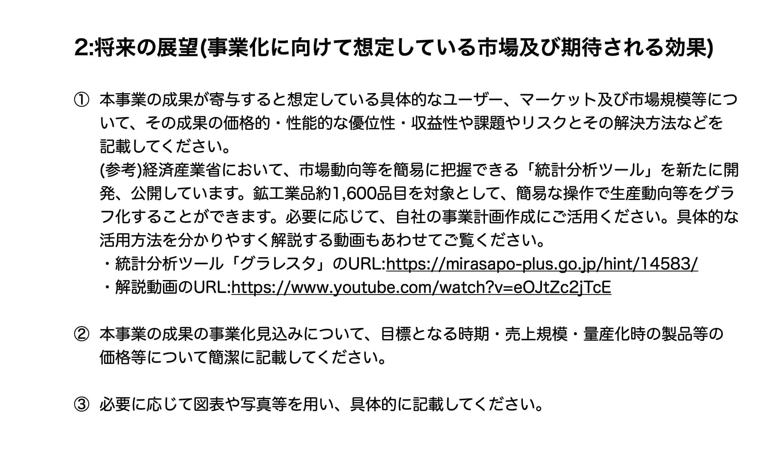 - 補助事業の成果が価格的・性能的に優位性や収益性を有し、かつ、事業化に至るまでの遂行方法及びスケジュールが妥当か。補助事業の課題が明確になっており、その課題の解決方法が明確かつ妥当か。