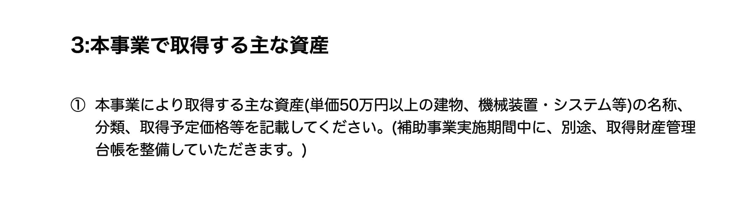 - 本事業により取得する主な資産(単価50万円以上の建物、機械装置・システム等)の名称、分類、取得予定価格等を記載してください。(補助事業実施期間中に、別途、取得財産管理台帳を整備していただきます。)