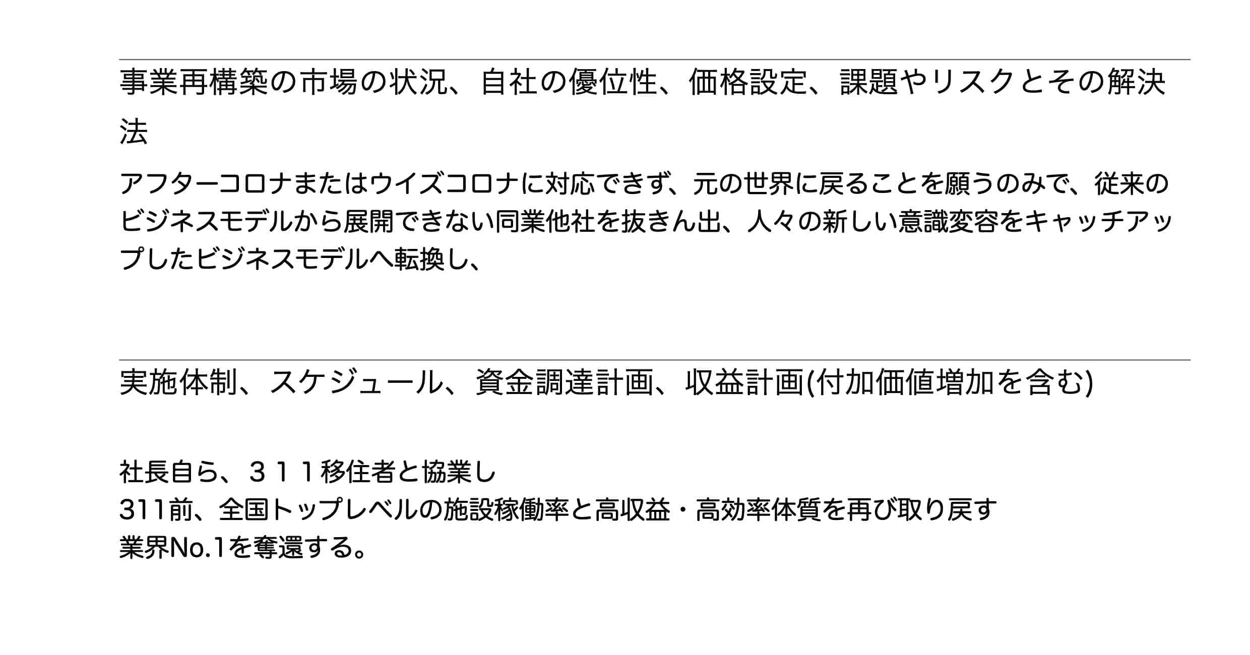 - 事業再構築指針に沿った取組みであるか。また、全く異なる業種への転換など、リスクの高い、思い切った大胆な事業の再構築を行うものであるか。