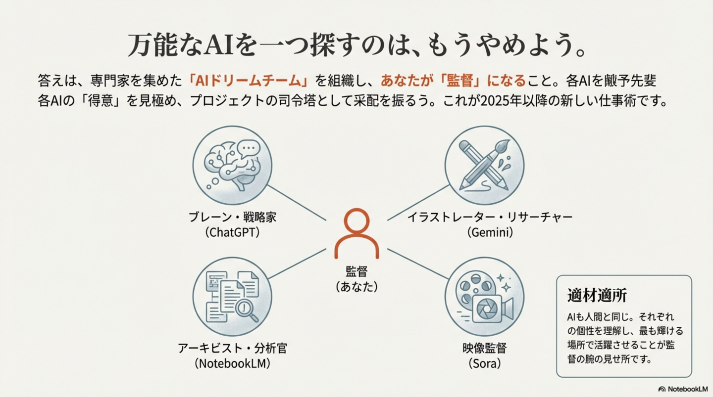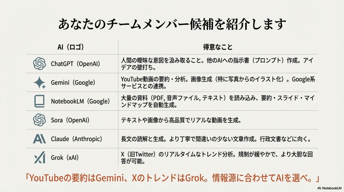 | Gemini | Google / YouTube | 動画要約、画像・漫画生成 | ツール間連携の不足 |