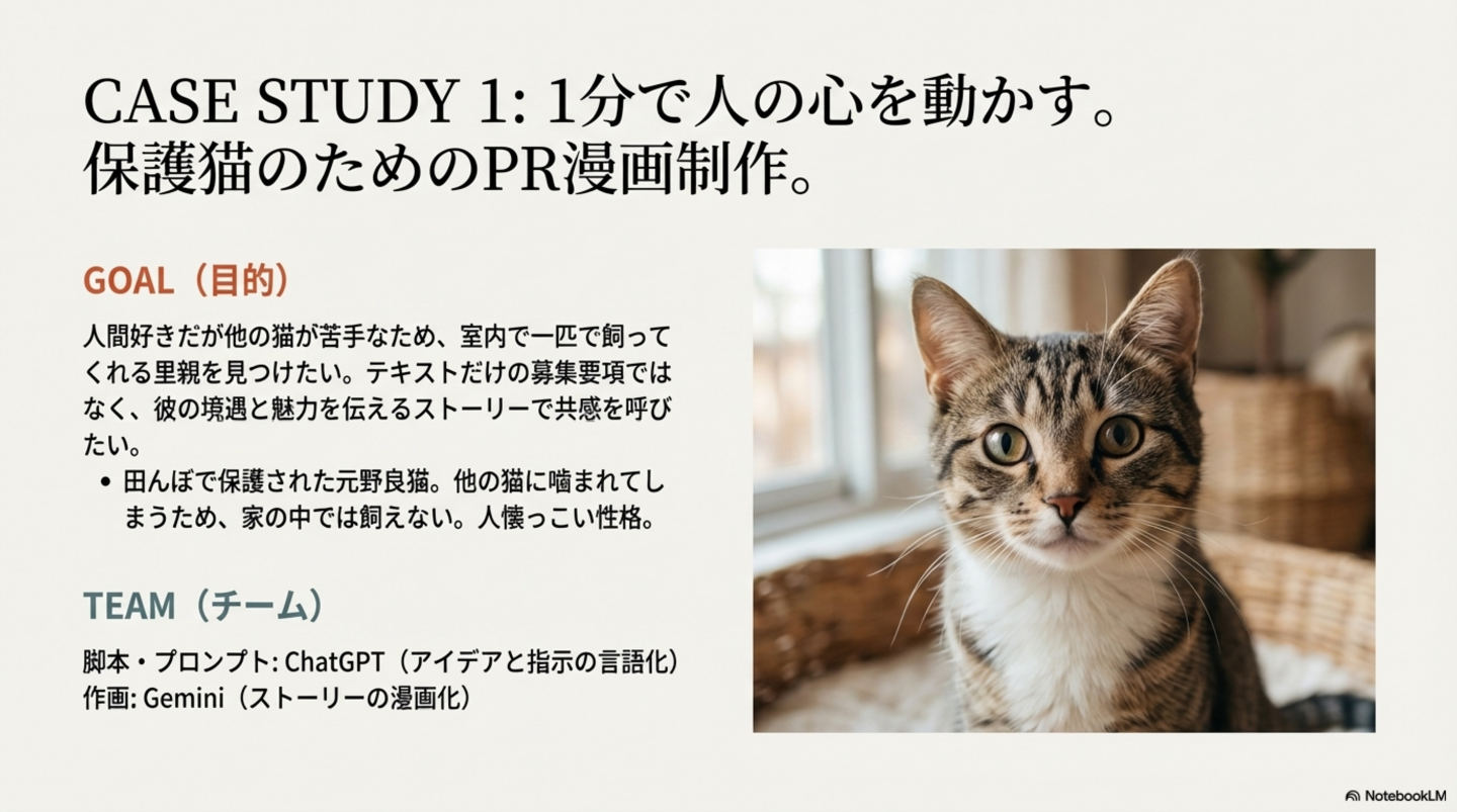 - ストーリーテリング強化: 保護猫が保護されるまでの経緯を伝える4コマ漫画をGeminiで作成。文字だけの説明よりも共感を呼びやすく、里親探しに貢献します。