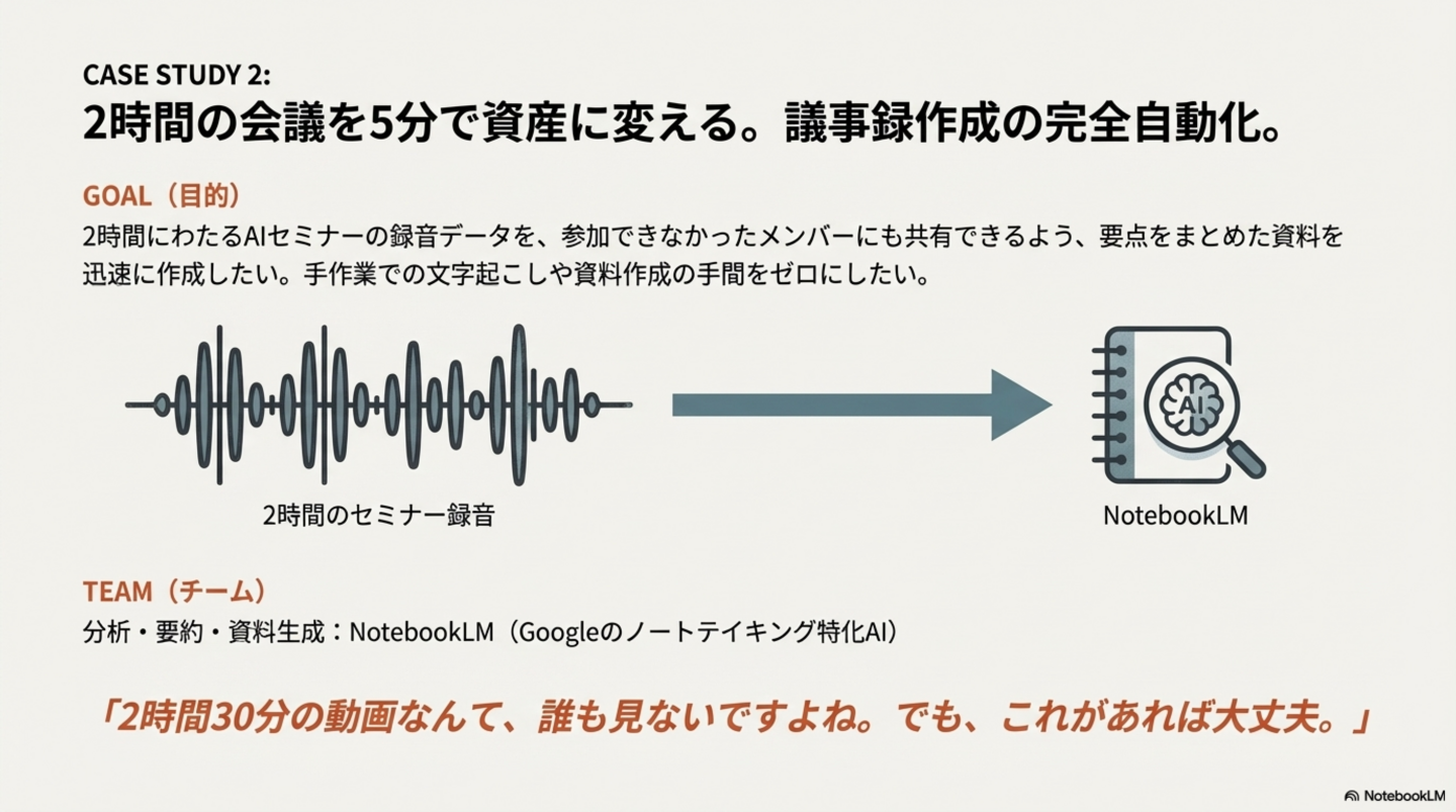 - 議事録・資料作成の自動化: NotebookLMを活用し、1時間半に及ぶ会議の音声ファイルから、文字起こし、要約、レポート、プレゼンテーションスライドに加え、音声解説(ポッドキャスト風)、動画解説(スライド付き)、マインドマップまでを自動生成。議事録作成にかかる工数を劇的に削減します。
