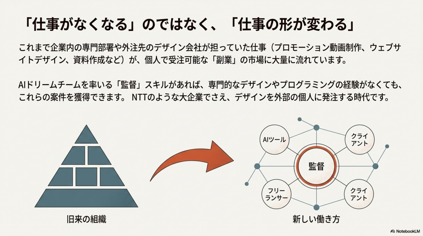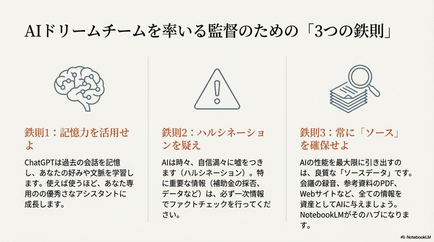 - 情報源(ソース)の重要性:独自のデータが価値の源泉に 今後のAI活用において、競争優位性の源泉はAIツールそのものではなく、それにインプットする独自の一次情報(ソース)へと移行します。NotebookLMの事例が示すように、社内会議の録音、専門分野の資料、顧客との対話履歴といった、他社がアクセスできないデータこそが、AIが生み出す価値の質と独自性を決定づけます。これは、個人がAIを活用して仕事を請け負う未来において、個々人が持つ専門知識や経験そのものが「ソース」として資産価値を持つことを意味します。