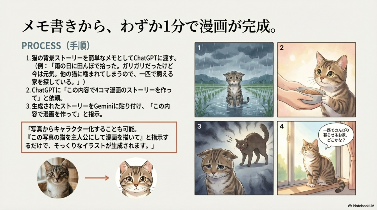 勉強会での実演は衝撃的でした。ある参加者が保護猫の一日を「朝起きてご飯食べて昼寝して夕方遊んで寝ます」というたった一行のメモから、複数コマの漫画を生成したのです。かかった時間は、わずか1分ほどでした。