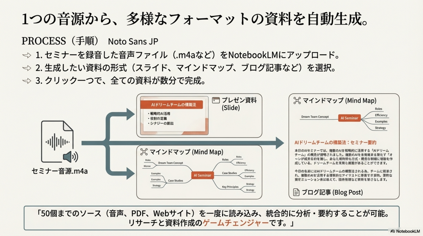 さらに驚くべきは、NotebookLMの真価が複数のソースを統合・分析する能力にある点です。今回のデモでは音声ファイル1つでしたが、実際には最大50個の異なるソース(音声、PDF、ウェブページ、テキストメモなど)を同時に読み込ませ、それらすべての情報を横断して一つのレポートやプレゼンテーションを生成できるのです。これにより、単なる議事録ツールから、強力なリサーチアシスタントへと変貌を遂げます。
