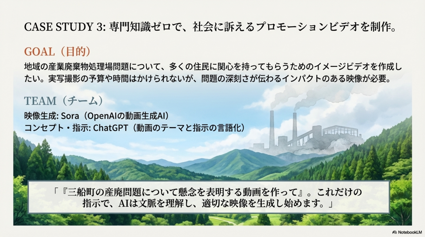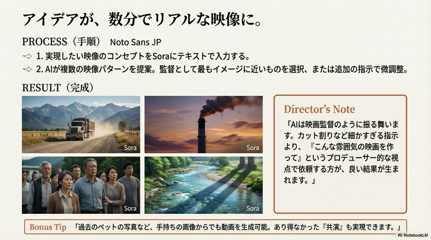 - 活用の要点: Soraへの指示は、詳細なカット割りを指定するより、「こんな映画」といった監督のような抽象的・世界観レベルの指示を与える方が、破綻なく高品質な映像を生成できるという実践的な知見が共有されました。