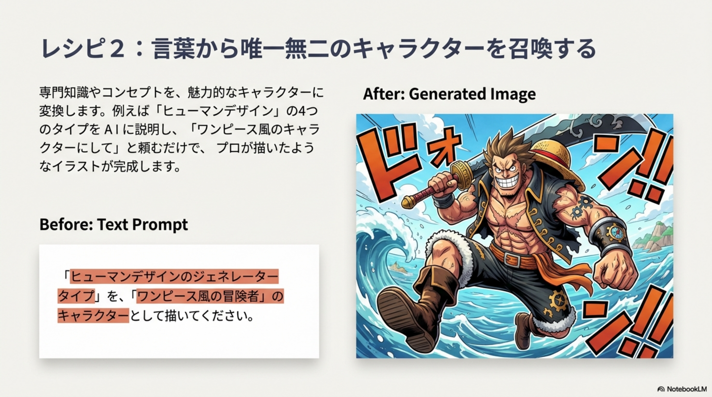 2. スタイル指示: それらの概念を「人気漫画『ワンピース』のキャラクター風に描いて」と、具体的な画風を指示します。