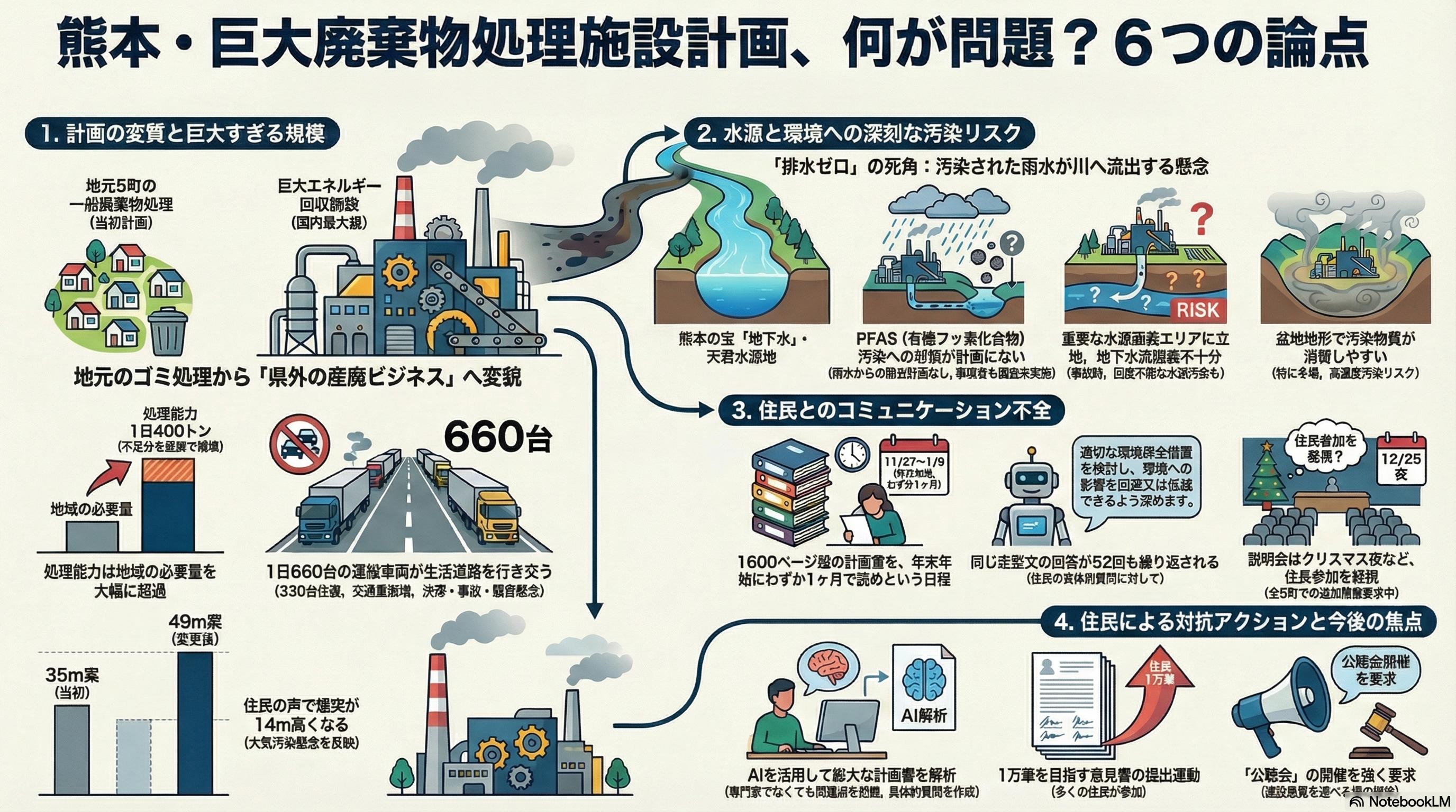 大型車両の通行増加による騒音・振動、粉塵や悪臭など、近隣住民の平穏な生活が脅かされる可能性があります。