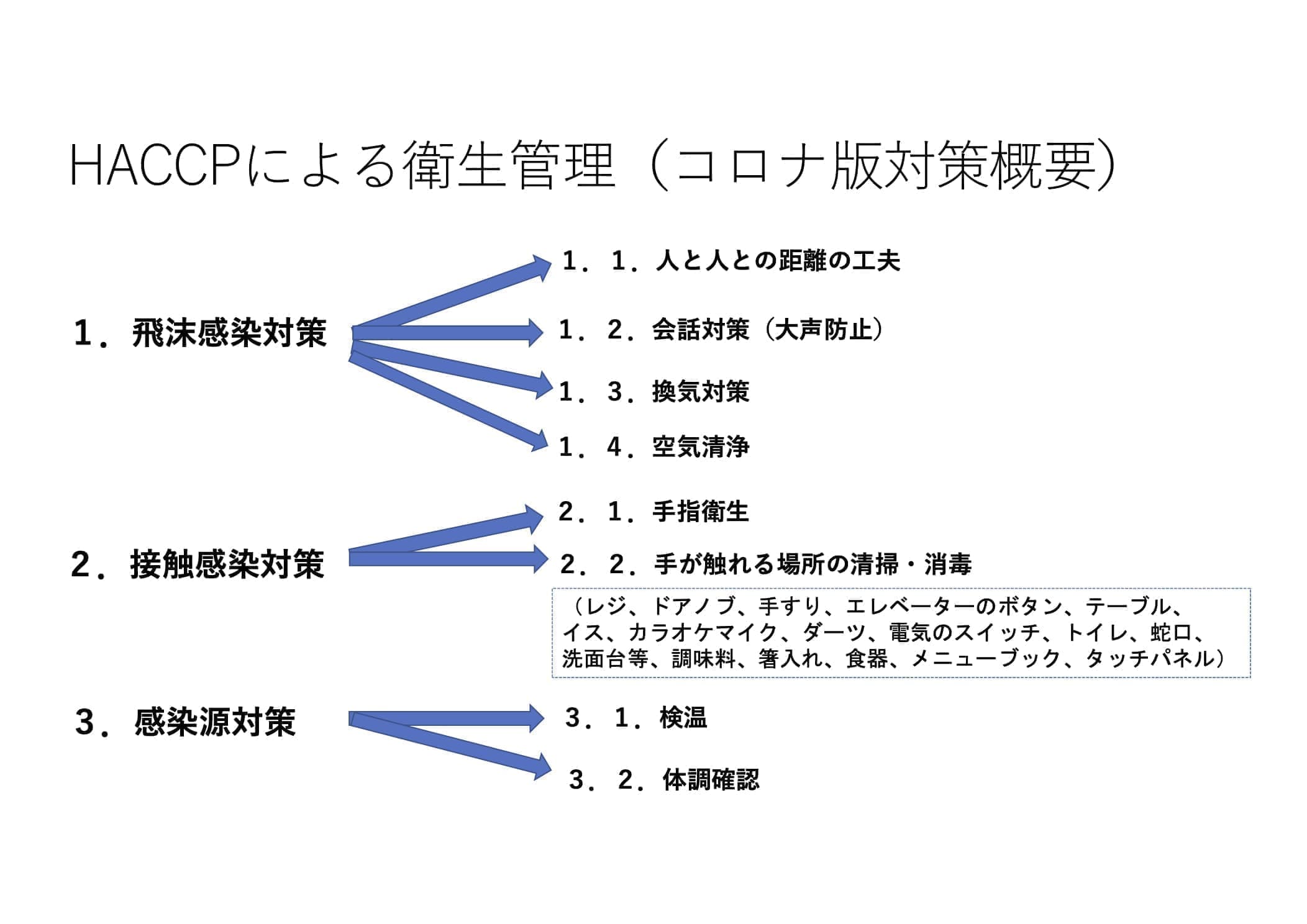 店舗内でのコロナウイルス感染症の発生する可能性のあるハザード(危害)を特定して、専門家の指導の下、適切に管理する仕組みを構築し、コロナウイルス感染症の店舗内での拡大を防止し安心・安全な店舗をつくりあげ、安全性を科学的測定でもって評価して記録し、広く公に公開し、お客様が安心して訪問していただけるように、HACCPによる環境衛生管理を実施する仕組みです。