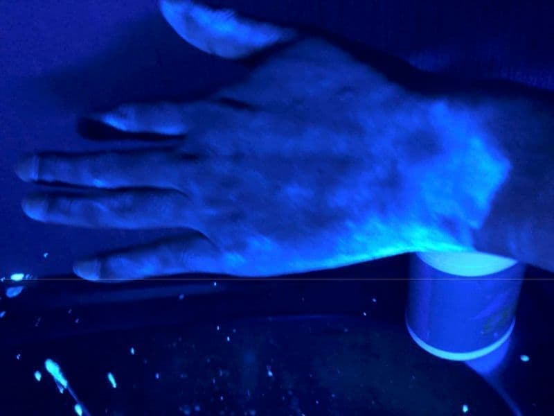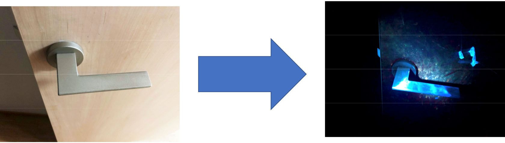 人の手が触れる場所の目に見えない汚れを、見えるようにすることにより、接触感染のリスクのある場所を明らかにするハザード分析技法である。蛍光塗料を塗った手の人が、店舗内で行動することにより触れた場所を特定することが可能である。接触感染のハザード把握に活用可能である。