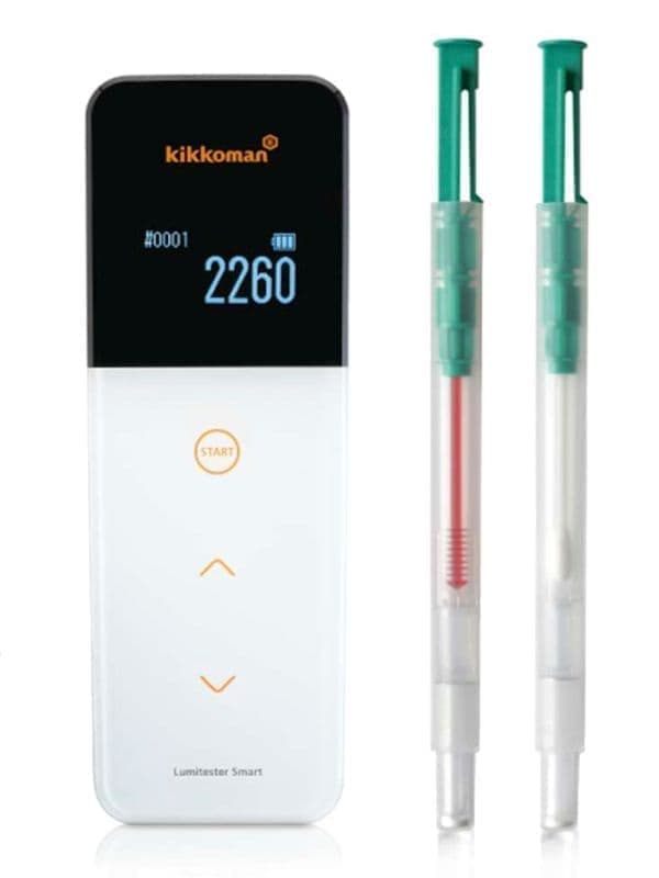 キッコーマンバイオケミファ株式会社製のルミテスターを使用して、人の目では確認できない汚れや残留物を、「ふき取り / 測定 / 分析」の3つの簡単なステップで検査することができ、結果の確認、数値化ができます。