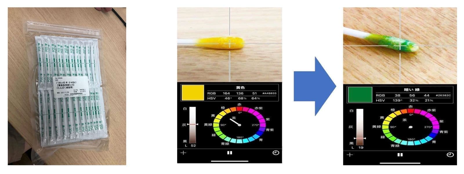 タンパク質ふき取り検査法は、極微量(80~40μg)のタンパク質量が存在すれば、青緑色の呈色があり、判定結果が 10 秒程度で得られ、目視で汚染状況の判定ができる。新型コロナウイルスはタンパク質が含まれており、 無機物上のタンパク質を測定することで洗浄度を判断する。ATPふき取り法よりも感度は落ちるが、ATPふき取り法が1回250円であるのに対して、タンパク質ふき取り法は15円程度の費用で実施でき安い。
