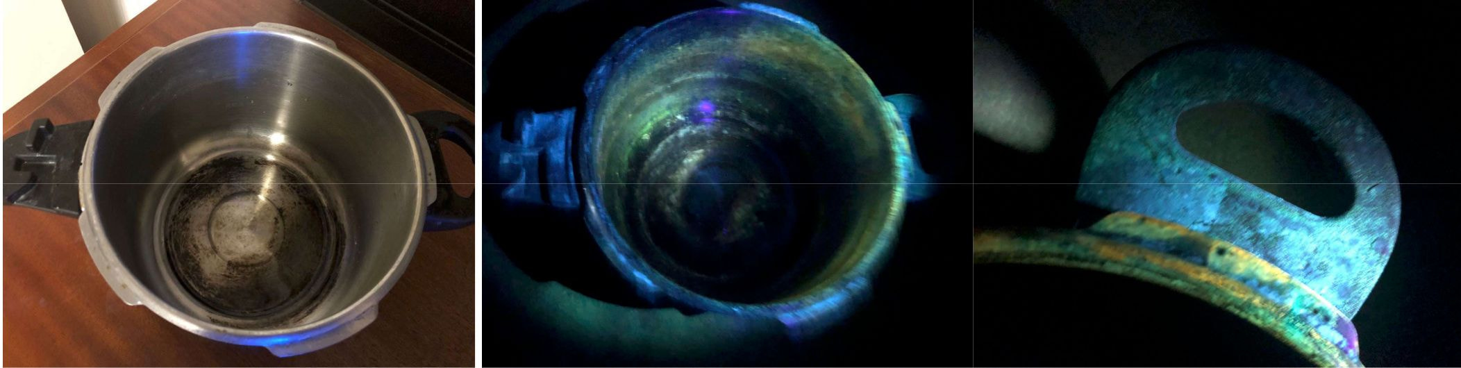 クルクミンは、ウコンの地下茎から作られる着色成分であり、ブラックライト (紫外線ライト)に反応して発光します。クルクミンは水に溶けにくく、油とアルコールに溶ける性質があります。そこで、クルクミンをアルコールで薄めた溶液を使用することにより、油汚れの残り具合を測定することができます。天然由来の成分であり人体には無害なことと、安値であることが特徴です。