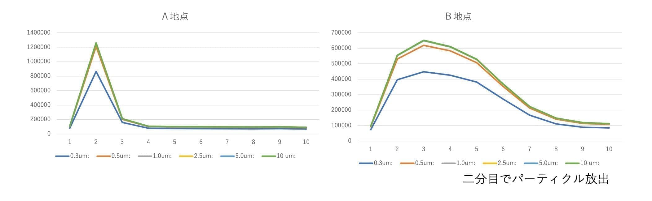 同一店舗内においても換気は異なります。そこで、パーティクルカウンターを使用して換気性能を調査します。A地点は、放出されたエアロゾルが、1分以内に9割消失して、2分目では完全に元の数字に戻っています。それに対して、B地点では、エアロゾルが半分になるのに4分を要しており、8分で元の数字まで下がっています。A地点では1分程度で換気が実現しているのに対して、B地点では8分を要していることがわかります。