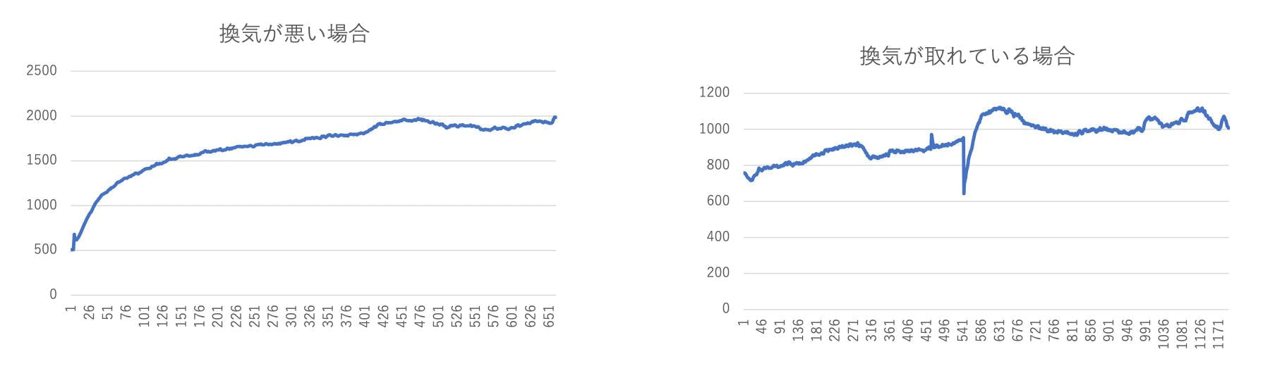 二酸化炭素の室内濃度を測定することにより、換気が適切に行われているかを理解することができる。同じ部屋でも、窓を開けているか、換気扇を回しているかなどの諸条件によって換気の程度は異なる。建築物環境衛生管理基準では、1000 ppm以下が基準として示されている。以下のグラフは同じ部屋(住宅)で左が窓開けなし、右が窓を5センチほど2か所開けた場合の二酸化炭素濃度の変化(1分置き測定)である。窓をわずかに開けただけでも効果は大きいことがわかる。