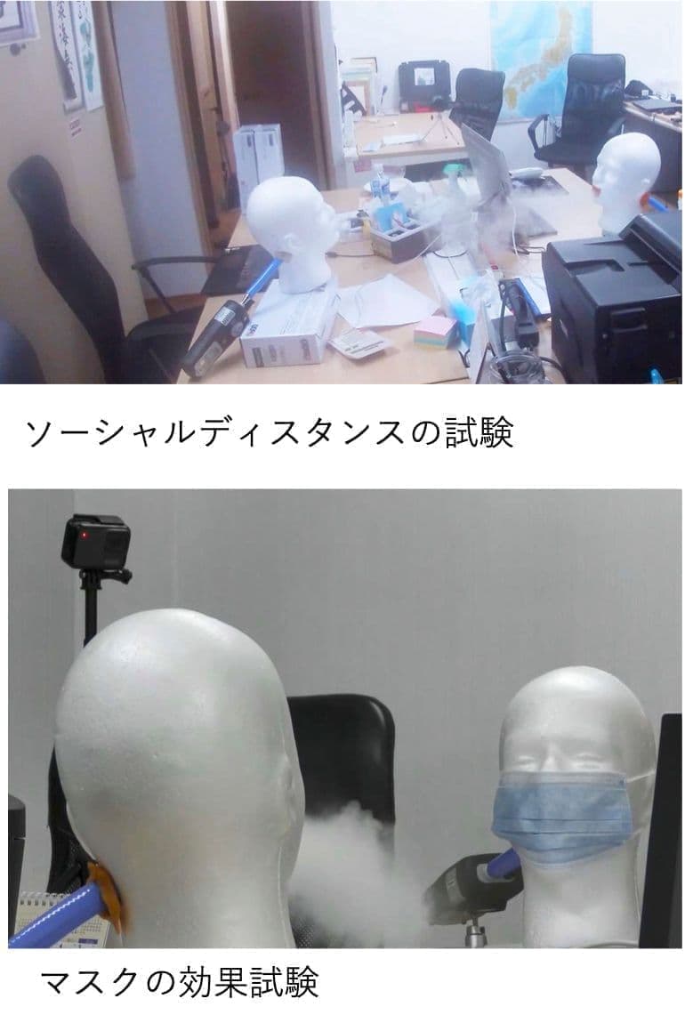 口から放出される飛沫量が少ないため、 飛沫の飛翔に関して傾向を見ることがで きません。そこで、濃度の濃い飛沫を放出する「矛」マネキンと、口の部分から 空気を吸い取って、飛沫の濃度を測定す る「盾」マネキンを使用して、飛沫が飛 翔する様子や、感染のシミュレーションを実施することが可能です。
