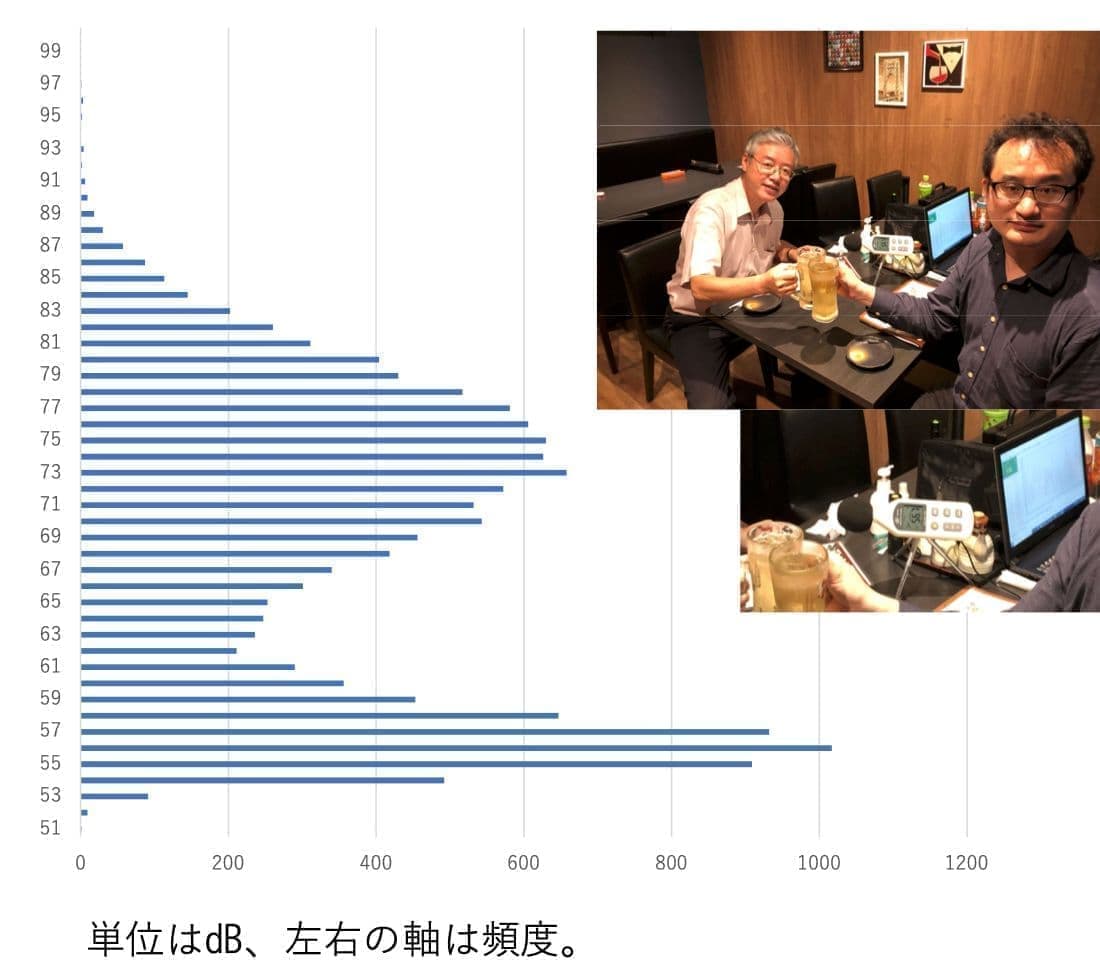 飲食時の会話の音量に関して、二人で飲み会を実施して1秒に1回の頻度で15008件の音量データを取得しました。それらの音量データをヒストグラフに示したところ右の図となります。