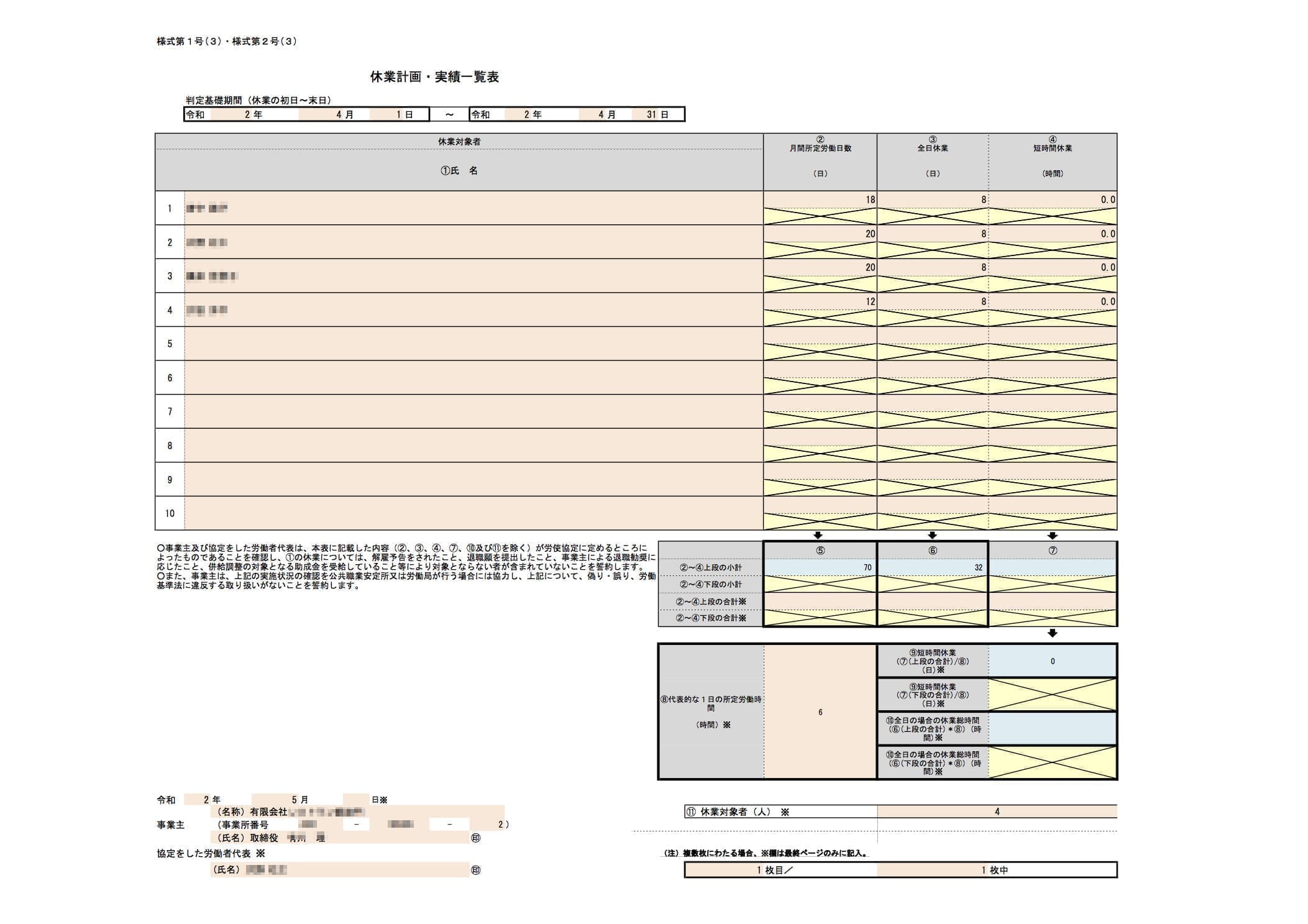雇用調整助成金と緊急雇用安定助成金 なぜ、私1人で4月と5月で約100回(事業所数は約60者)の支援を行えたか? それは、オリジナルシフト表を作成しているからです。 (写真は20日締の例:最初に見出しに2020/3/21と入力すれば、令...