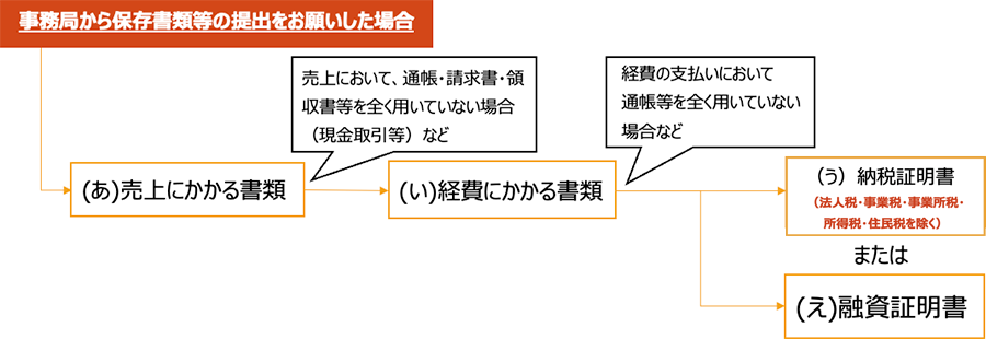 提出いただいた証拠書類等から給付要件を満たすことが確認できなかった場合には、保存書類等のご提出をお願いする場合がございます。
