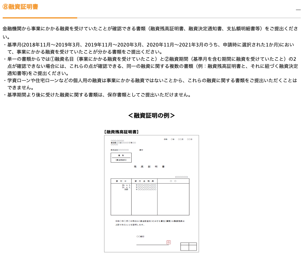 ※選択いただいた基準月(2018年11月~2019年3月、2019年11月~2020年3月、2020年11月~2021年3月のいずれか1か月)において、事業にかかる融資を受けていたことが確認できる融資証明書をご提出ください。