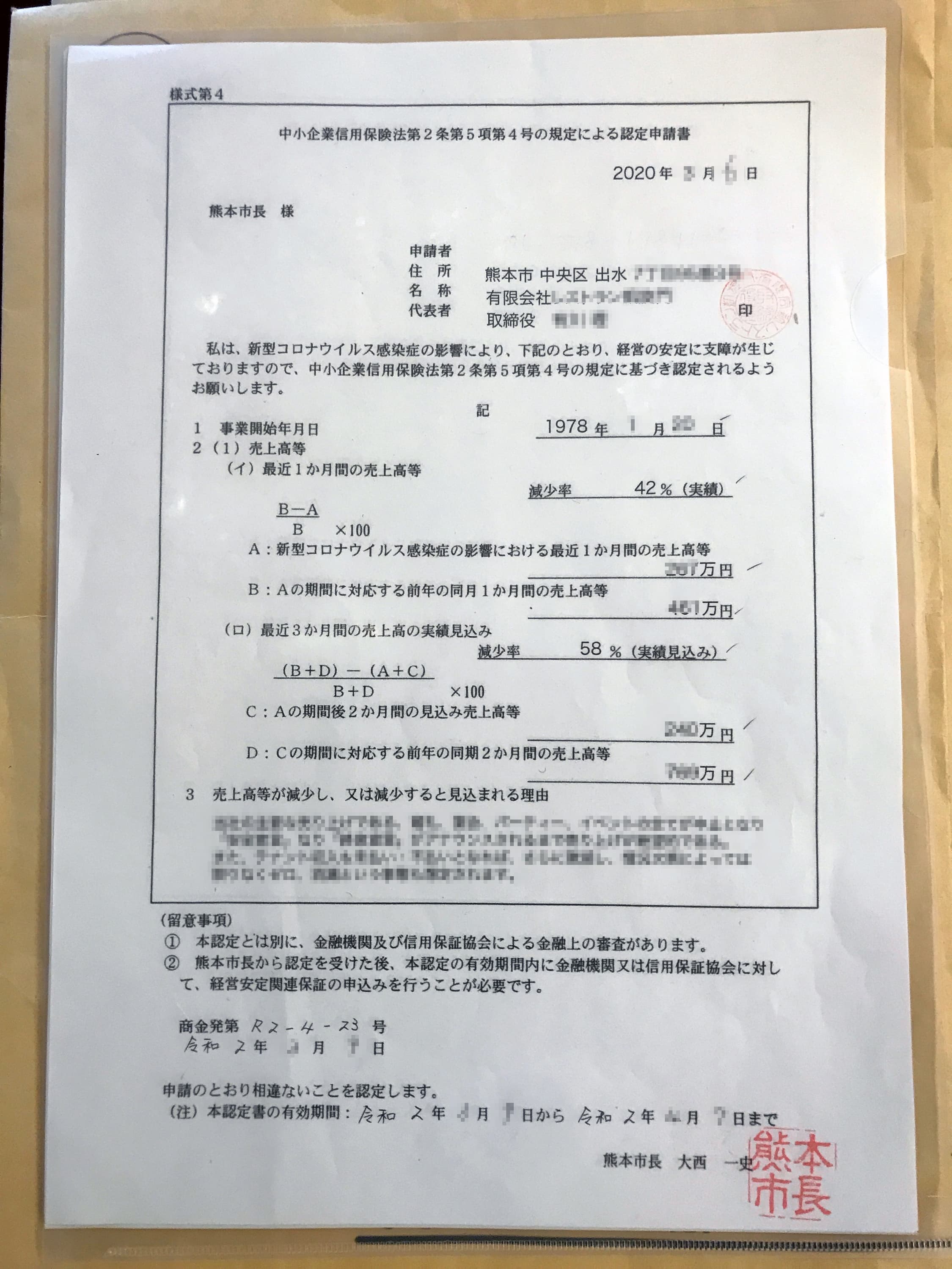 市区町村発行の売上減少証明書<20%以上売上減少>、もしくはセーフティーネット保証4号の認定書(コピー可)