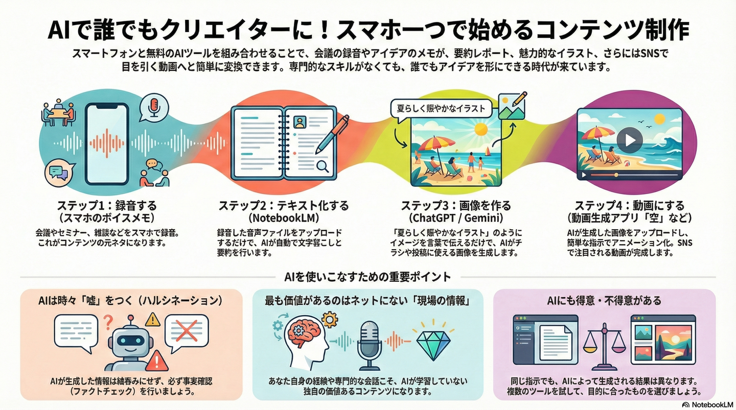 本勉強会は、参加者の皆様のAI活用スキルを、単に情報を「調べる」段階から、コンテンツを能動的に「作る(生成する)」段階へと引き上げることを目的としています。現状、多くの方がAIを高度なGoogle検索のように利用していますが、そこから一歩踏み出し、AIの生成能力を使いこなすことは、個人の影響力を高め、ビジネスオペレーションを効率化する上で極めて重要な戦略的転換点となります。