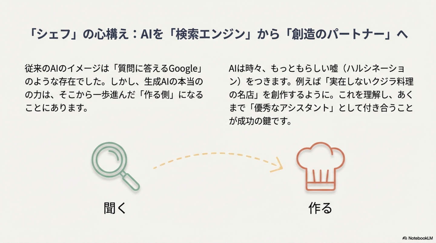 このリスクを明確に理解し、その軽減策を講じることで、私たちは事実確認の段階を自信を持って乗り越え、AIの真の強みである創造的な生成活動へと移行できます。次章では、それを実現するための具体的なワークフローを探求します。