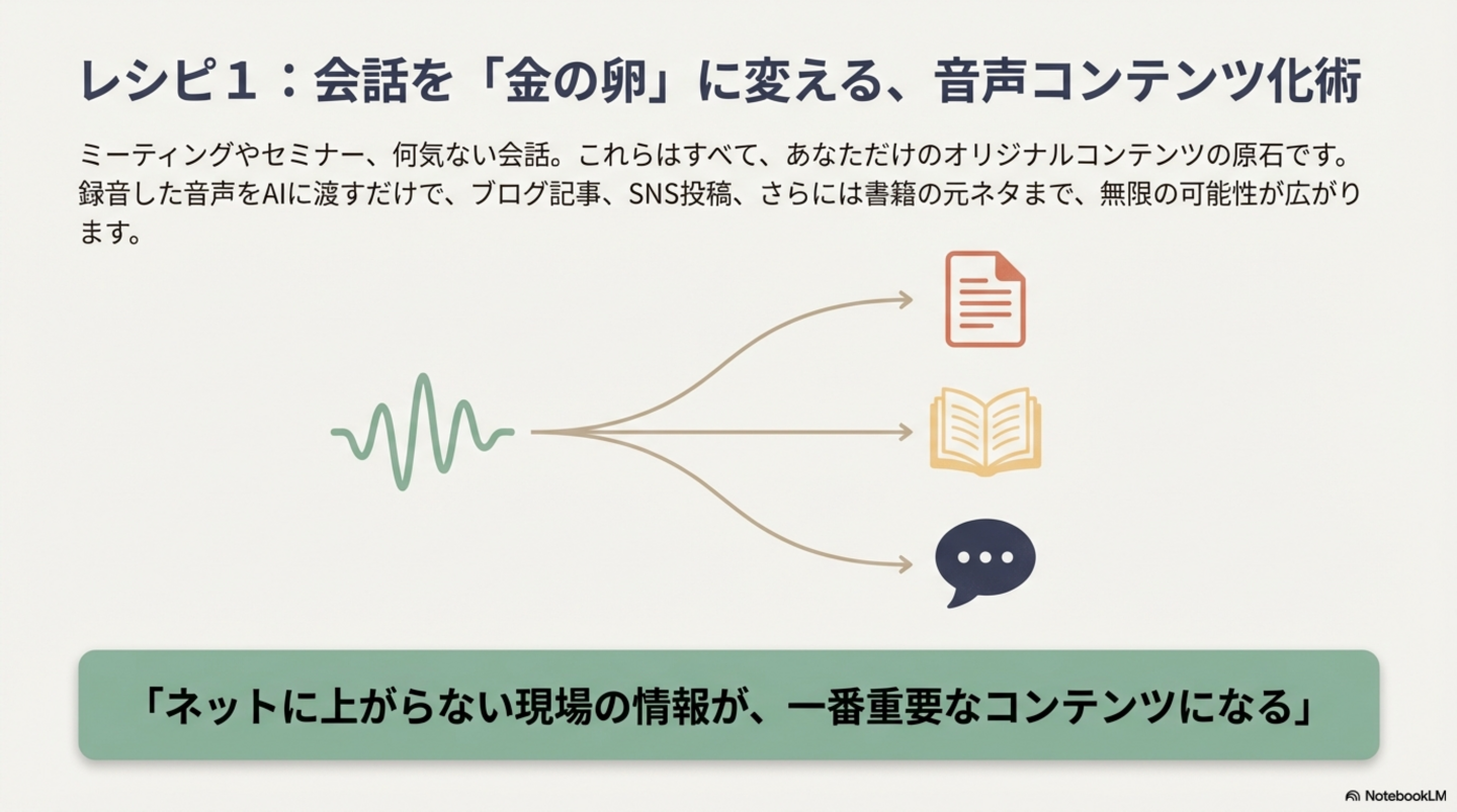 会議やセミナーでの会話は、インターネット上には存在しない貴重な「一次情報」です。これらを録音し、AIを用いて資産化するプロセスは、極めて価値の高いコンテンツ創出手法となります。生の会話を価値あるコンテンツ資産へと転換するため、以下の戦略的ワークフローを採用します。