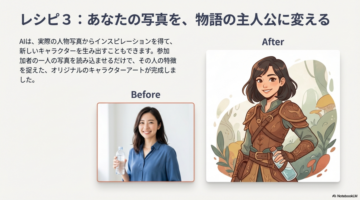 4. 応用: 参加者の写真をAIに読み込ませ、その人物をモデルにしたオリジナルキャラクターを生成することも可能であり、パーソナライズされたコンテンツ制作への展開も示されました。
