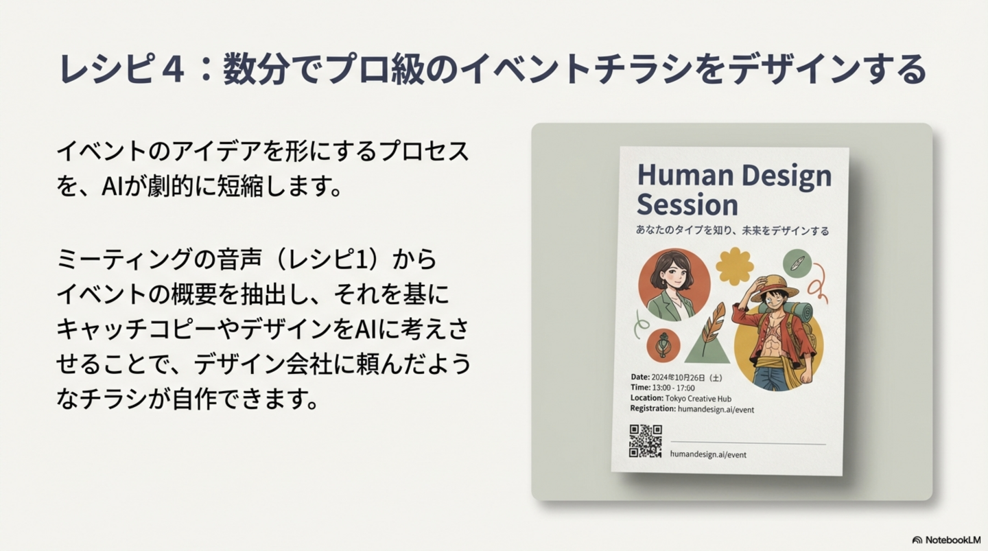 AIを活用することで、デザインの専門知識がなくとも、プロレベルのビジュアルコンテンツを容易に作成できるようになりました。ヒューマンデザインのイベントチラシ作成がその好例です。