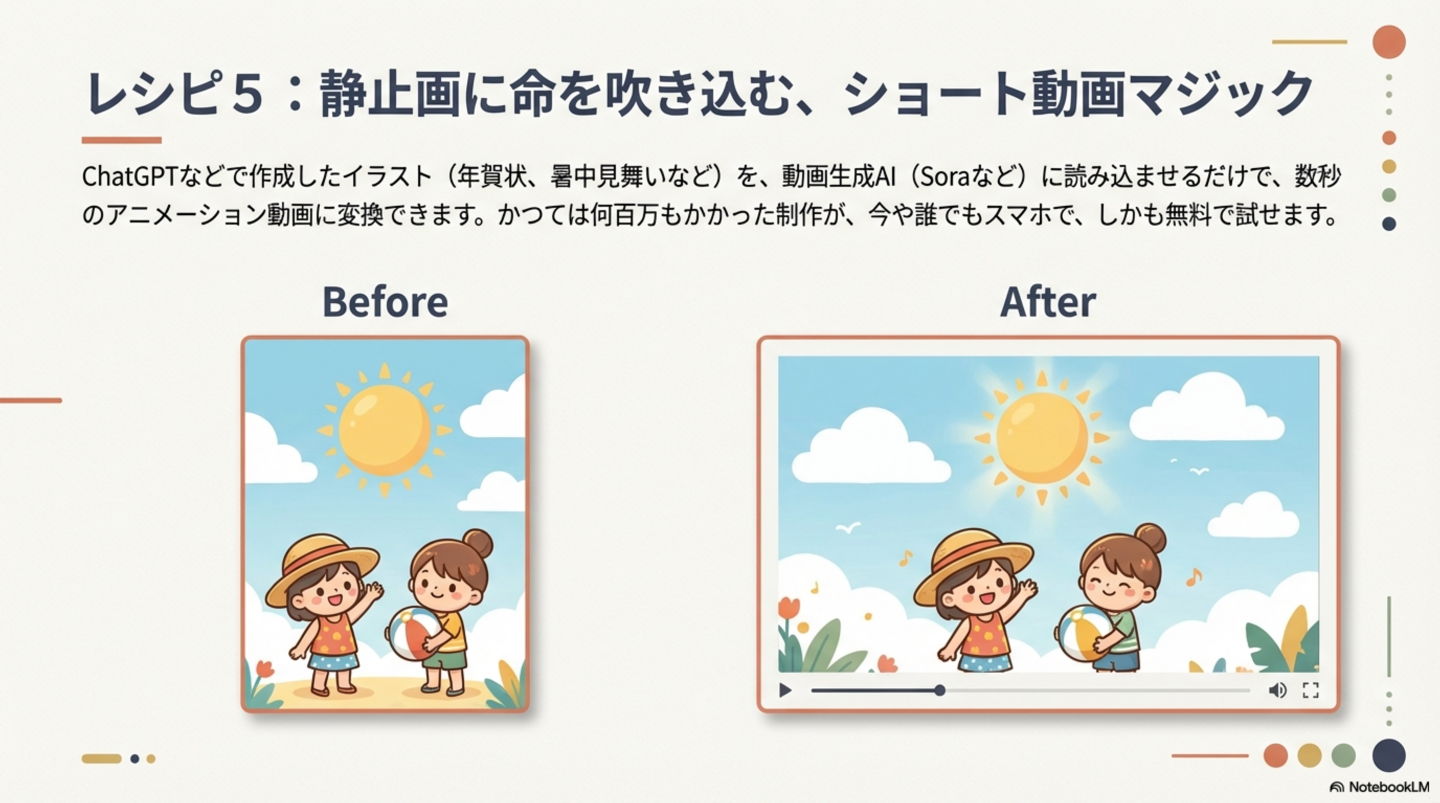 * 作例1(イラストの動画化): ChatGPTで生成した「暑中見舞い」のイラストをSoraに読み込ませ、イラスト内の要素(雲や太陽など)が自然に動く短いアニメーション動画を生成。