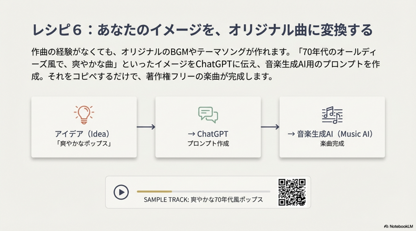 * 音楽制作: Suno AIといったツールを使えば、「サザンオールスターズ風の曲を作って」のような簡単な指示だけで、著作権フリーのオリジナル楽曲を生成できます。歌詞もChatGPTに相談しながら作成することが可能で、誰もが作曲家になれる時代が到来しています。