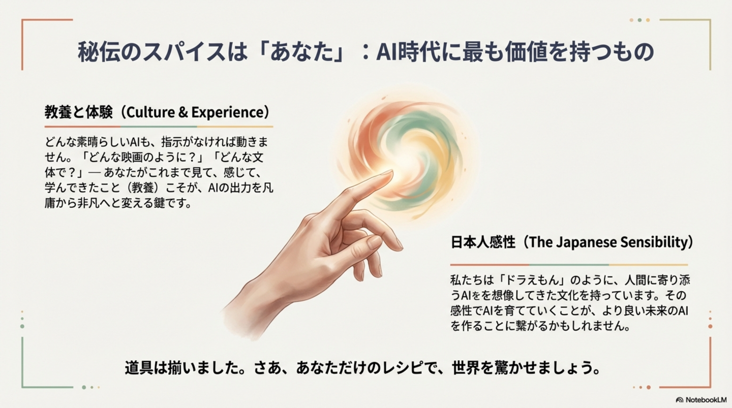 * 「教養」の重要性: AIに的確で質の高い指示を出すためには、文学、哲学、芸術史といった幅広い分野の知識や原体験に基づく「教養」が不可欠となります。なぜなら、豊かな語彙、そして文化的、歴史的、芸術的な深い知識や体験こそが、AIを新しく、繊細で、真に魅力的な作品の生成へと導く指示(プロンプト)を生み出すための原材料となるからです。この人文的な基盤がなければ、プロンプトは凡庸なものに留まり、結果もまた同様となります。