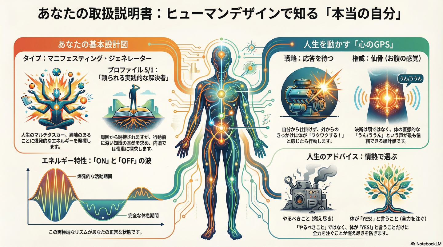 - ジェネレーターの特性: 持続的な生命力エネルギー(仙骨エネルギー)を持ち、自分が情熱を持てることに対して驚異的な持久力を発揮します